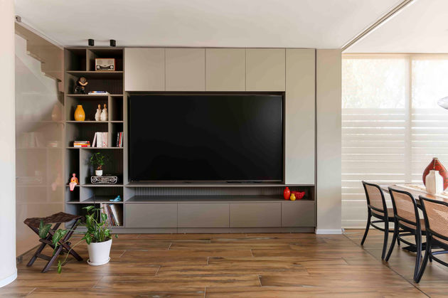הפכנו את המטבח לחלק מאוד משמעותי בבית מאחר והכל בו סובב כל הזמן סביב אוכל ואירוח, ואת הסלון שהפך להיות מפנק ורחב עם טלויזית